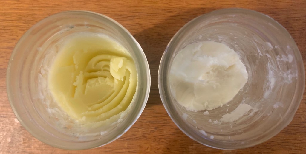 You can easily make your own butter! After leaving the cream of raw milk on the counter overnight, I use my hand blender to churn the cream until it separates into a solid (butter) and liquid (buttermilk). Then, I pour off the buttermilk and add as much water as the buttermilk I poured off. I churn the butter with the water to “wash and work” the butter (to cleanse it of any additional buttermilk). Pour off the water to add fresh water, and again churn the butter. Repeat the “washing and working” process until the water you pour off is mostly clear.